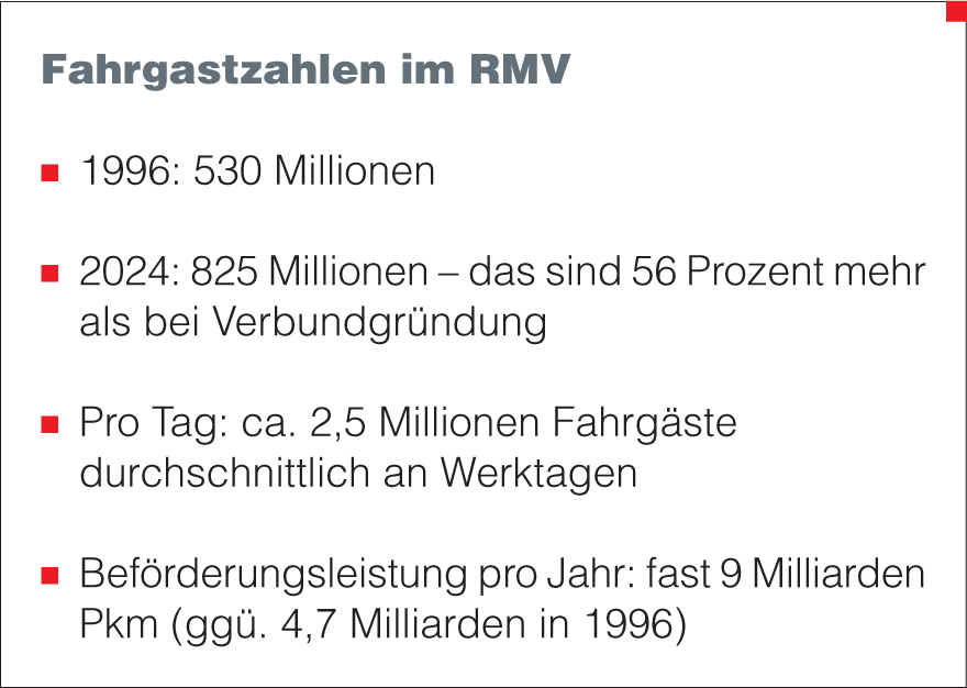 Der RMV umfasst ein Gebiet von 14.000 Quadratkilometern mit rund 5 Millionen Einwohnerinnen und Einwohnern –Übergangsgebiete eingeschlossen sogar 6,7 Millionen. Die Fahrgastzahlen sind seit 1996 um 56 Prozent gestiegen – von 530 Millionen auf 825 Millionen im Jahr 2024. Allein die Zahl der täglichen S-Bahn-Fahrgäste hat sich seit 1996 vervierfacht. Auch die jährlichen Personenkilometer stiegen von 4,7 auf fast 9 Milliarden. Zahlen, die zeigen: Der RMV ist nicht nur das Rückgrat der Mobilität in der Region, er ist ein wesentlicher Motor ihrer wirtschaftlichen Stärke und Lebensqualität und somit Symbol und Synonym für die Region Frankfurt-RheinMain.